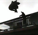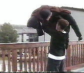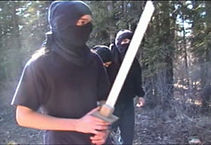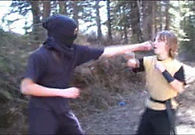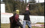 Left: The last clip of the film to be shot and edited, spring 2004. In this scene, the execution of Hing Fat features an effect achieved by playing with variations in playback speed. It creates the illusion that a spear is thrown into Hing Fat's stomach, impaling him to a wooden board. The idea for this came from listening to the director's commentary for the Mel Gibson film, Braveheart. Also notice the frequent pixelating of the image. This occurred due to the adoption of a Digital Hi8 camcorder, which was fortunately easier to transfer to the computer for editing, but also suffered from this serious technical failing; a rare malfunction in that particular camera.